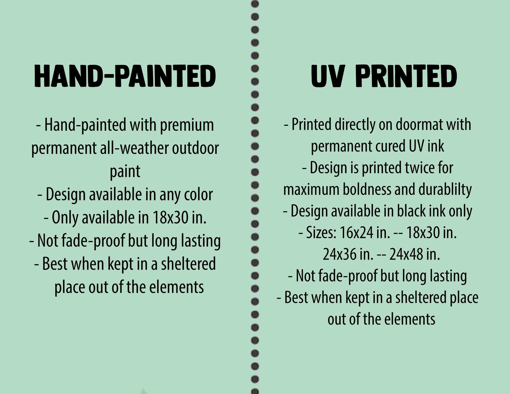 HAND-PAINTED: Available in any color of paint. Doormats are hand-painted with premium all-weather outdoor paint. Only available in 18x30 inches.