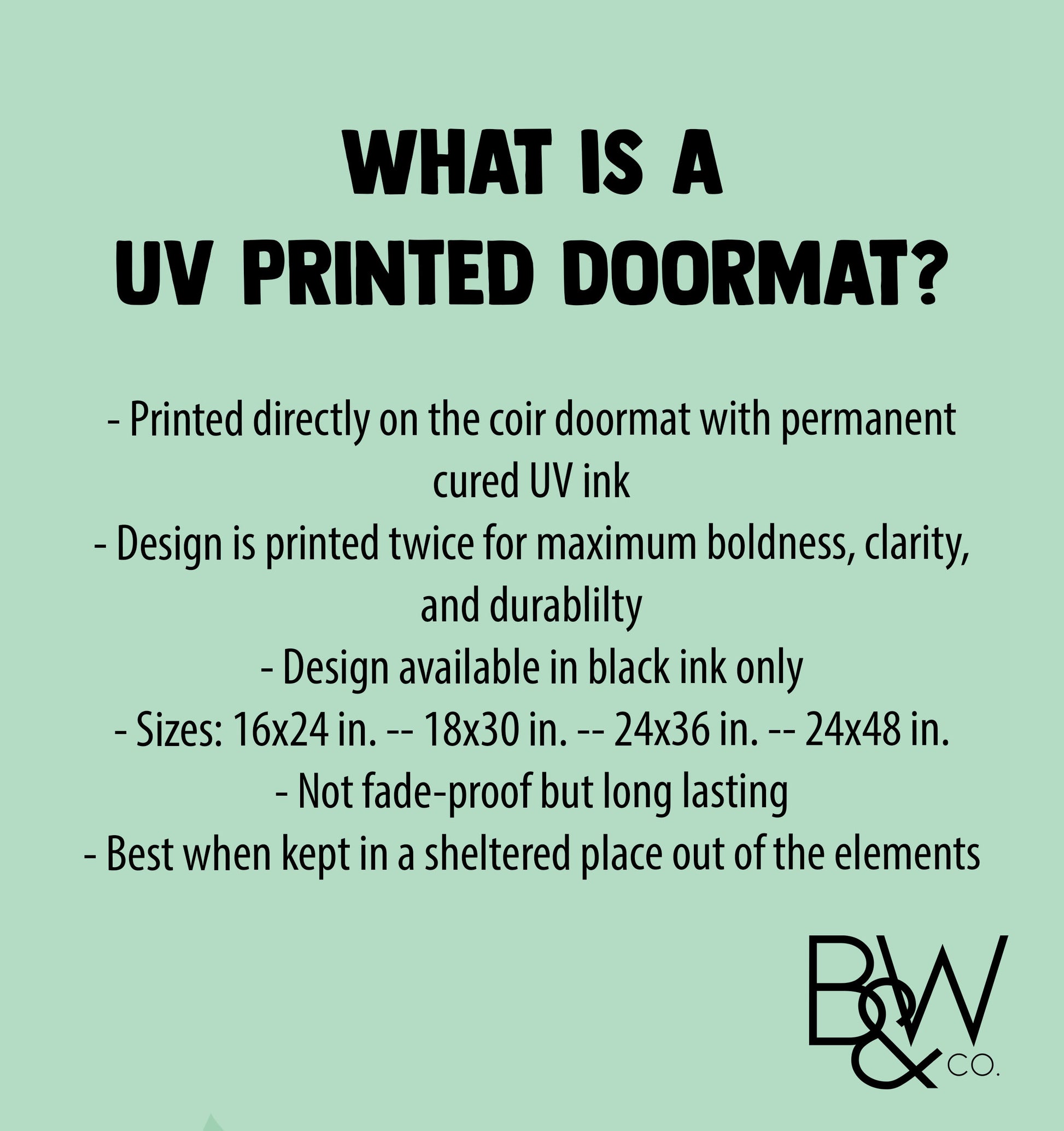 UV PRINTED: Available in black ink only. Doormats are printed with permanent cured UV ink. All doormats are printed twice for maximum boldness, clarity, and durability. Available in 16x24, 18x30, 24x36, and 24x48 inches.